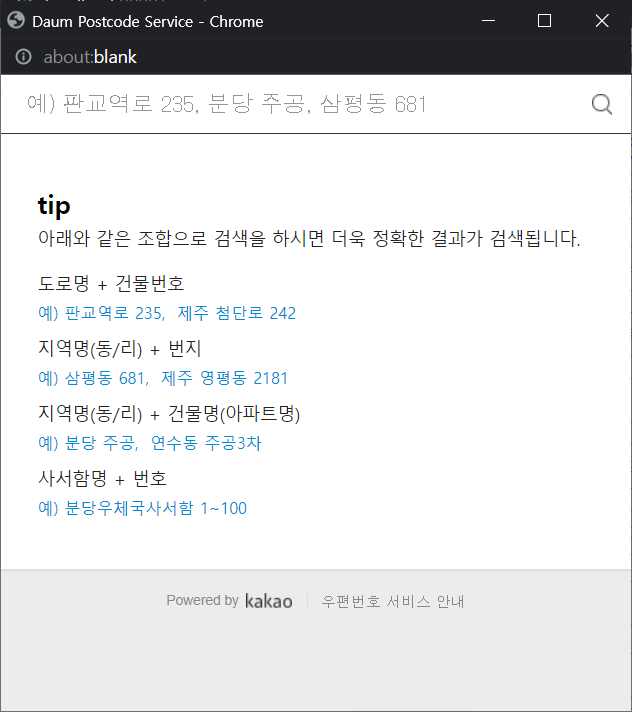 | DAUM 주소찾기 API 동 주소 활용하기 (2) | 2022.11.16 |
