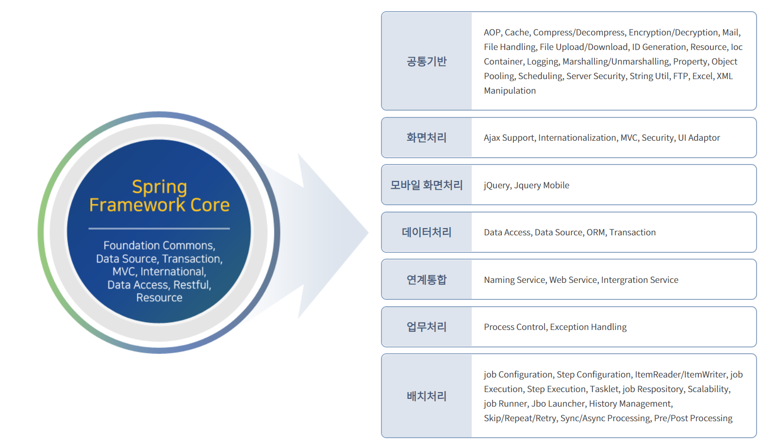 Java 기반의 웹 프로젝트 개발에 필요한 Spring의 핵심적인 기능들을 포함,